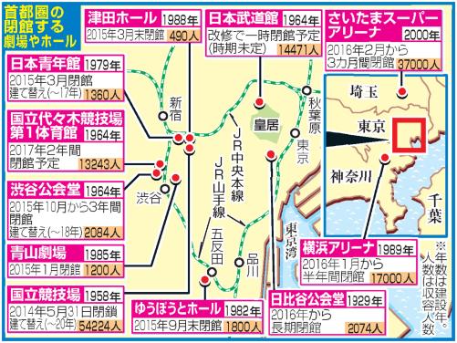 ここ数年、首都圏の劇場やホールの閉館・改修が相次いでいる。音楽ライブや演劇を行う施設が減少し、アーティスト、演奏家らは満足に公演ができない現状に危機感を募らせている。特に大きな会場の改修が今年に集中していることから「2016年問題」と呼ばれ、その影響は地方にも及ぶ。ライブ・エンタメ業界は我慢の時を迎えるが、施設のリニューアルは、東京五輪後の集客増に向け明るい材料との声もある。